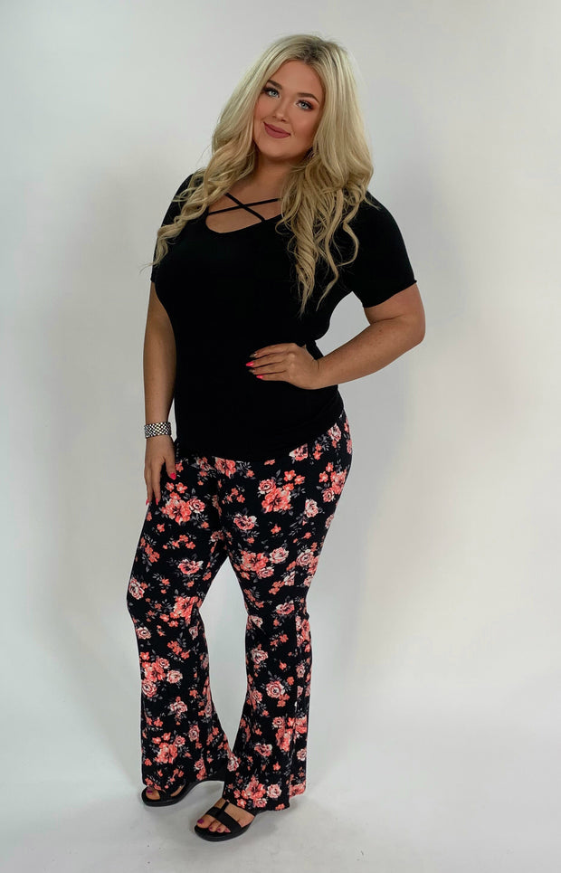BT-U {Color Me Happy} Black Floral Print Pants W/ Flare Bottom L