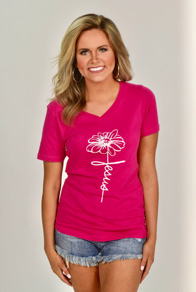 GT-J {All Mine} Fuchsia V-Neck T-Shirt with Flower/Jesus Stem