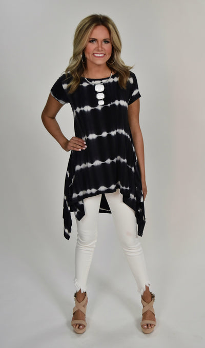 PSS-B {No Hazy Days} Blue & Ivory Tie Dye Sharkbite Hem Tunic