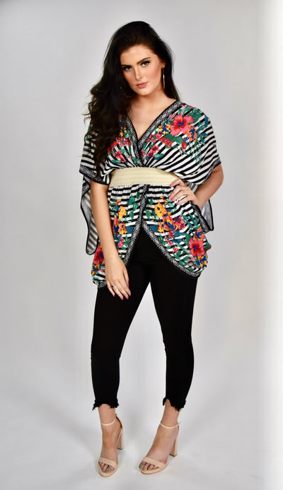 PSS-B {Dream Date} Black Floral Striped Top Elastic Waistband