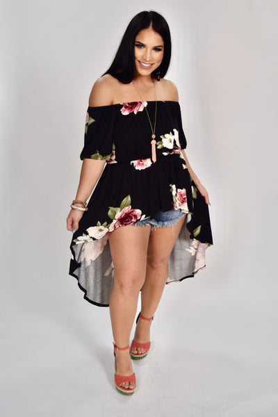 PSS-F {Summer Kiss} Black Floral Print Hi-Lo Tunic