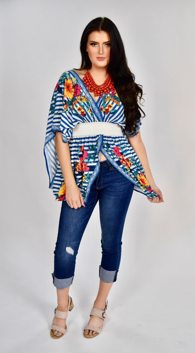 PSS-A {Dream Date} Blue Floral Striped Top Elastic Waistband