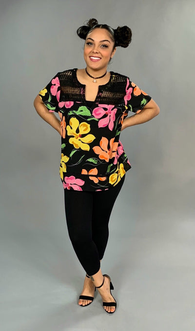 {Tropical Tide} Black Floral Top with Crochet Detail Plus Size