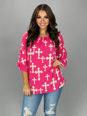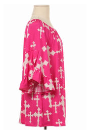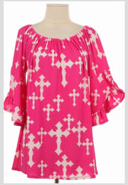 PQ-C {Show The World} Fuchsia Bell Sleeve Tunic with Cross Print