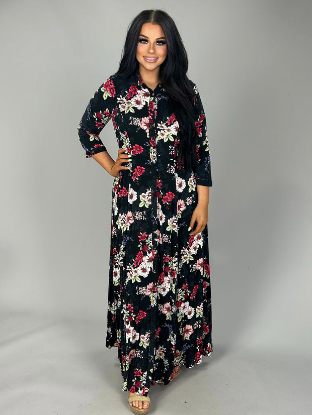 LD-A {Fields Of Flowers} Black Floral Print Dress W/ Button Detail