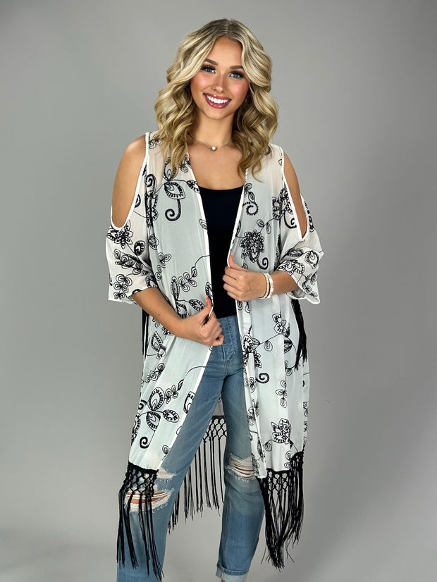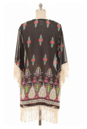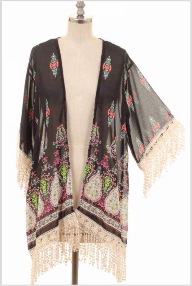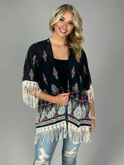 OT-A {Risk It All} Black Printed Cardigan with Crochet Fringe Detail
