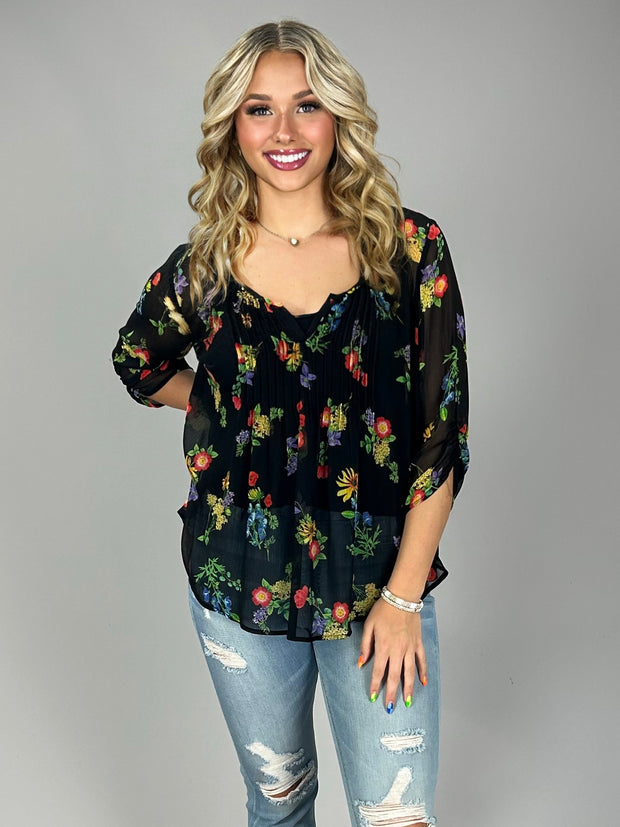 CP-Z {Stay Tuned} Black with Floral Print Sleeves Tunic