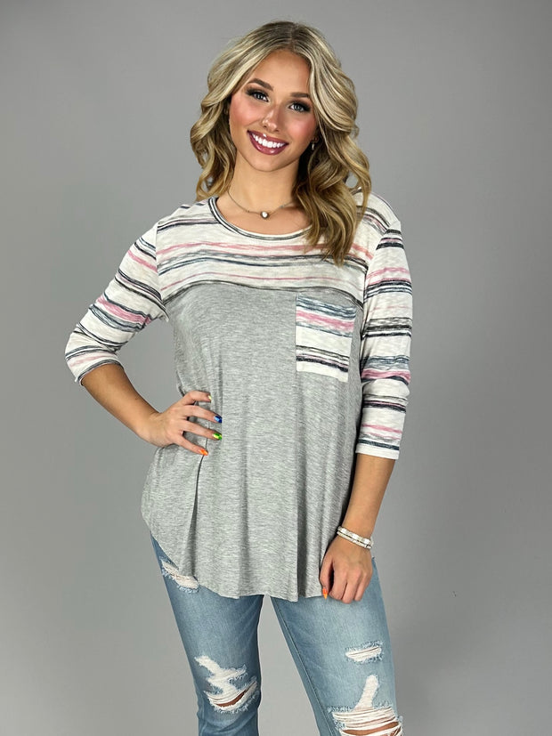 CP-J {Let's Get Lost} Gray Pocket Top with Pink/Navy Contrast