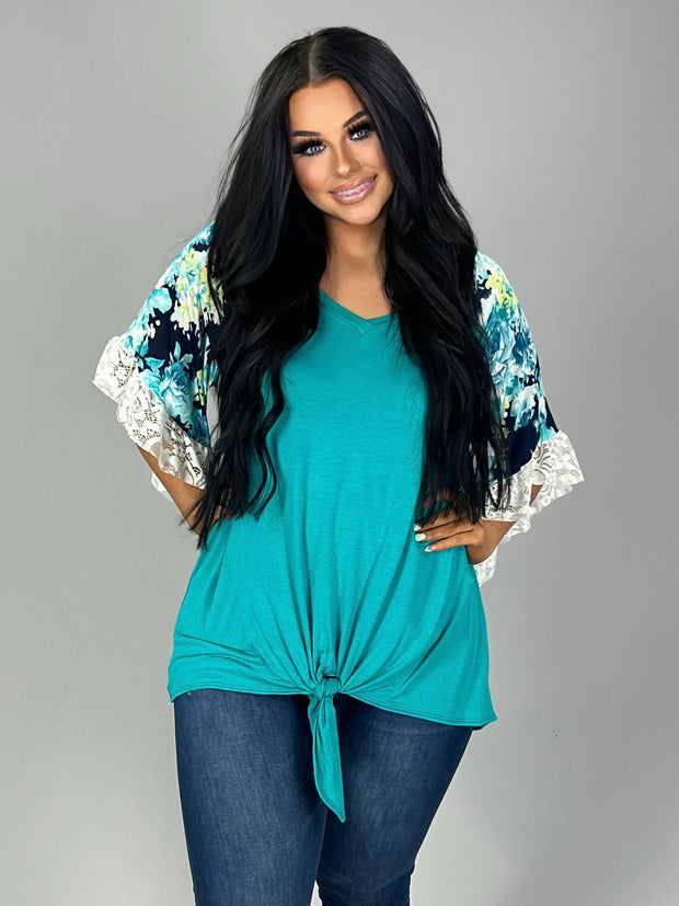 CP-O {Eternal Princess} Teal Front Tie Top with Floral Lace Sleeves