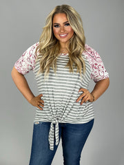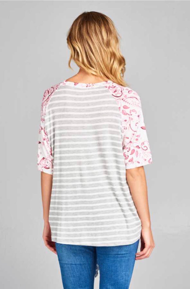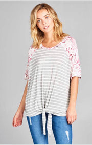CP-F {Enjoy The Breeze} Gray Striped Top Floral Contrast