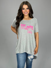 GT-B {Mom Life} Gray Hi-Lo Top with Hot Pink Letters