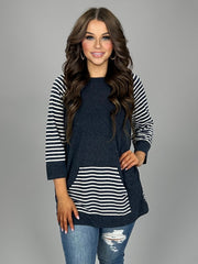 CP-C {Spring Fling} Navy Floral Contrast Top with Striped Sleeves