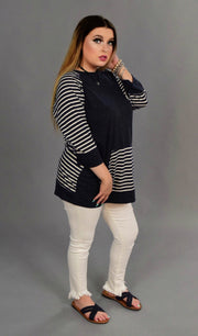 {Spring Fling} Navy Floral Contrast Top with Striped Sleeves Plus Size