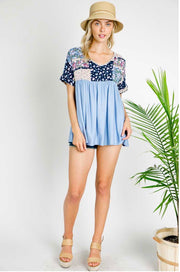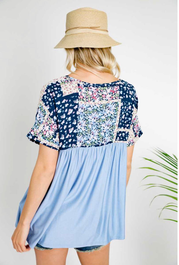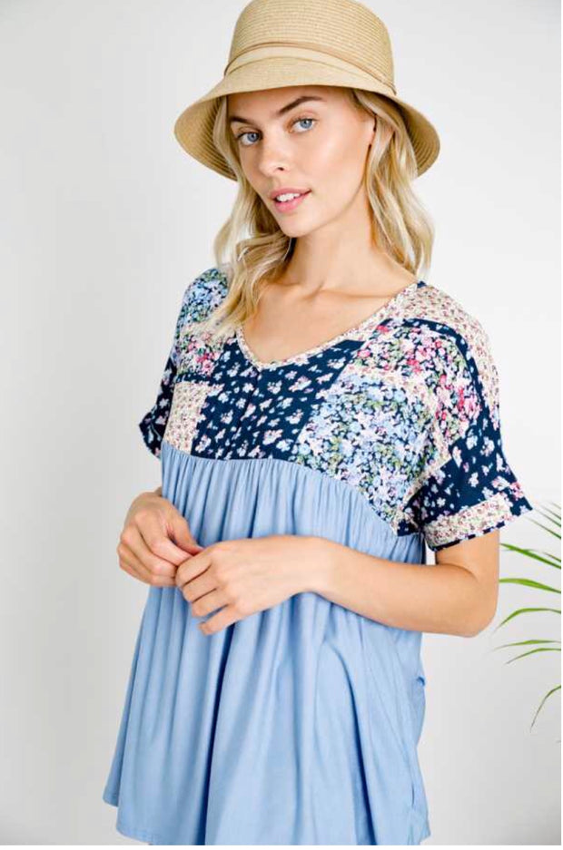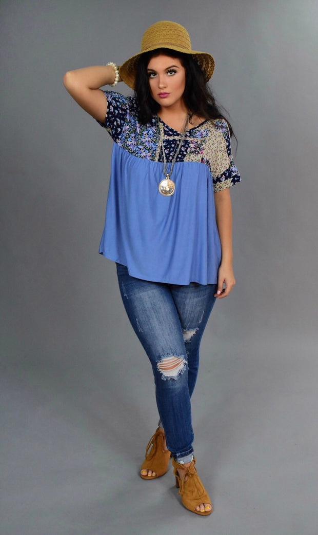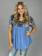 SALE!! CP-A The Sweetest Life} Blue Top with Floral Print Contrast