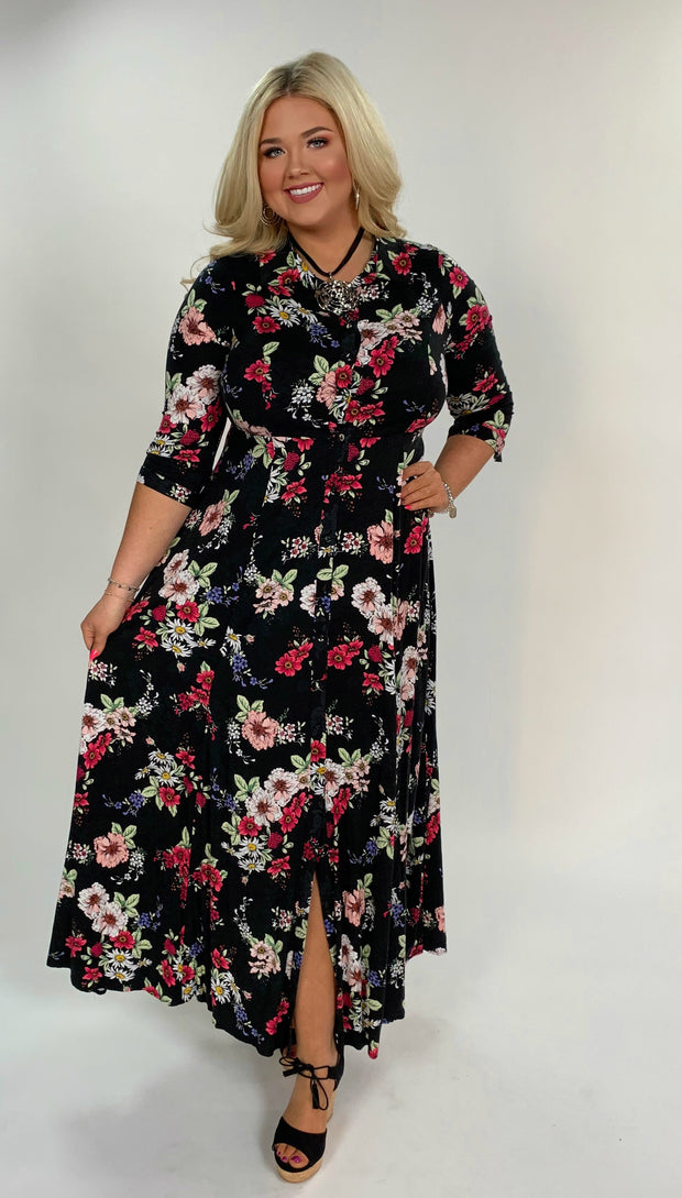 LD-A {Fields Of Flowers} Black Floral Print Dress W/ Button Detail