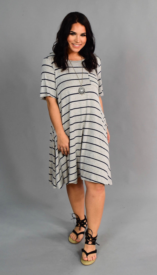 PSS-J Heather Gray/Navy Striped T-Shirt Dress with Pocket